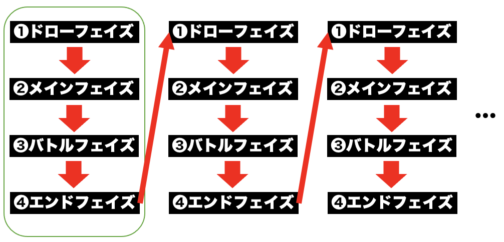 このゲームはターン制で進行していき、自分と相手のターンを交互に繰り返します。また、1ターンの中には、それぞれできることが異なる4つのフェイズがあり、下記のように進行していきます。